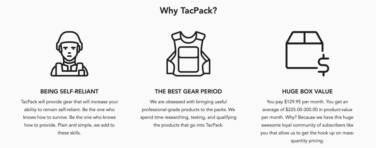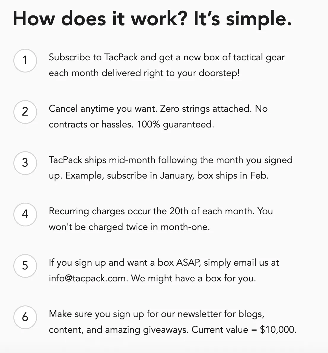 TacPack believes in a no-hassle cancelation policy where you are done as soon as you say so. You can cancel at any time.
